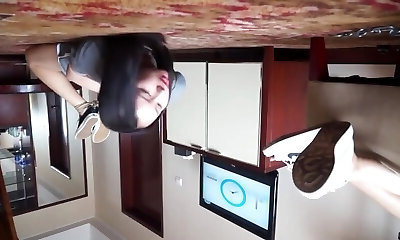 Skinny Asian mistress in brief skirt tortures her slave on the floor