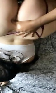 Pretty dark haired girlie with astounding caboose uses fuck stick to grind her twat