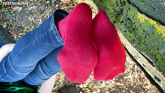 Adorable Soles And Toes Wiggling In White Nylon Socks In The Woods