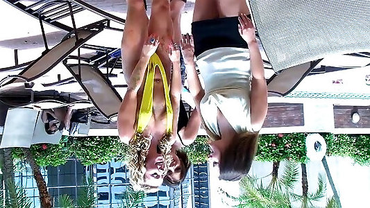 Four girls are enjoying stripping in the swimming pool, with one lucky guy joining them