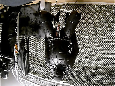 Strung Up pierced cock shemale cums ball-gagged in my hefty condom helmet