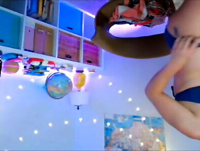 Chubby pigtailed teen smokes a cigarette while dressed in tiny bikini, striptease
