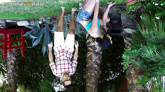 Ebony-haired Eastern babe touches her cunt next to the backyard pool