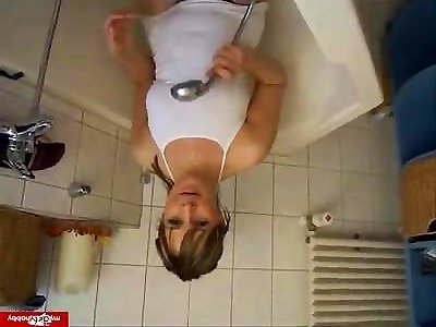 Teenie showers in her tee-shirt and panties and they cling to her assets