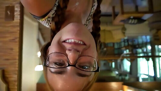 Adorable, nerdy babe with glasses and braids is jacking like kinky in front of the camera