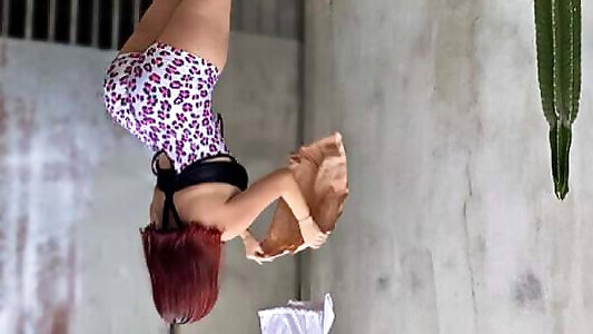 Maid with big butt wearing sexy clothes hanging clothes on clothesline in backyard