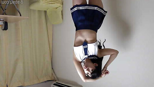 Japanese kayden kross as friends sister in no bra, miniskirt uniform and thong panties doing exercise then takes off her sweaty clothes and gets naked