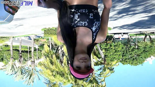 Huge-chested young sex addict is prepped to give her puss by the pool