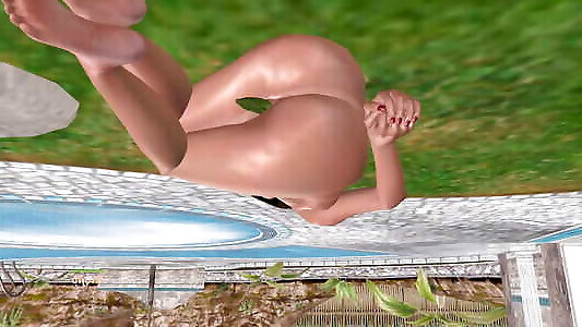 An animated 3d porn video of a beautiful sex scene of a cute girl masturbating using bottle near swimming pool