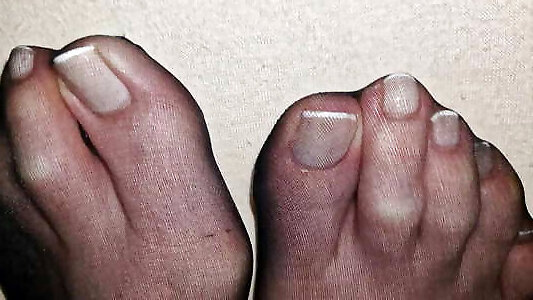 Dark-hued nylon sock on Wifey&039;s french toenails in detail decorated by thick jism fountain