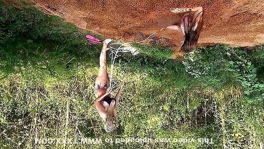 Dark-haired tethered cougar bitch buried in the ground outdoors