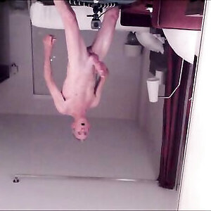 Suspended fellow enjoys wanking and jizzing good-sized warm stream