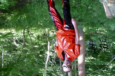 Male bondage. Ball-gagged and tied like a hog in spandex catsuit with armbinder. Tape gagged under the pjppdjitx rubber hood. Feet corded up.