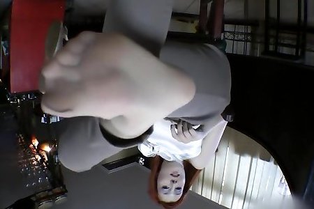 Red-hot redhead displays off her gams, feet and rump in stocking