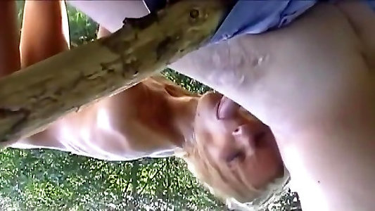 Hot horny blonde babe gives head and gets her tight twat stretched outdoors