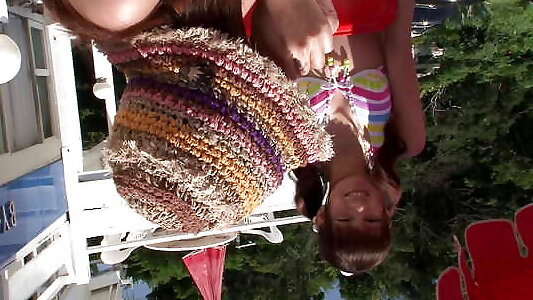 Sandy-haired female in bikini frolicking with lollipop and screwed