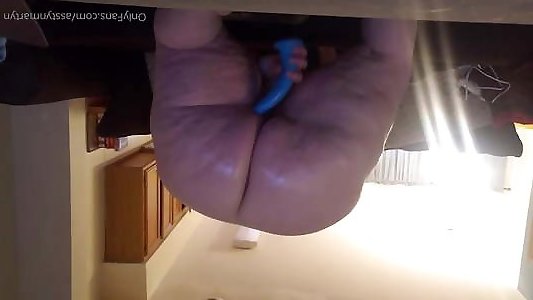 In jeans and bare feet, PAWG slowly rides a big ribbed dildo