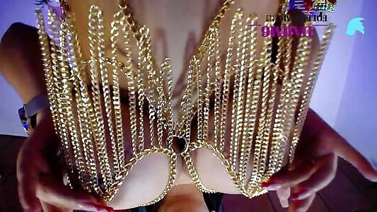 Sexy goddess plays with her big tits in chains outfit fuck big tits and sucks her nipples with a lot of pleasure