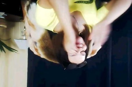 Thong denim shorts wedgie ass and pussy, natural boobs stick out of mini t-shirt by Japanese tanned girl exercises