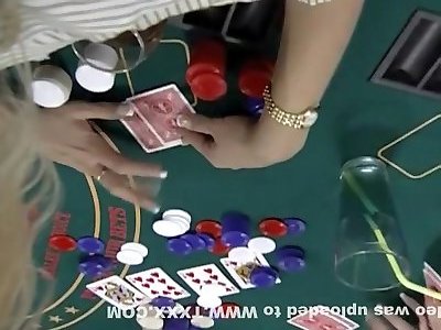 Big-chested brunette mega-bitch deep throats and screws after playing poker
