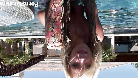Beauty babe with amazing boobs rides big dick near swimming pool!