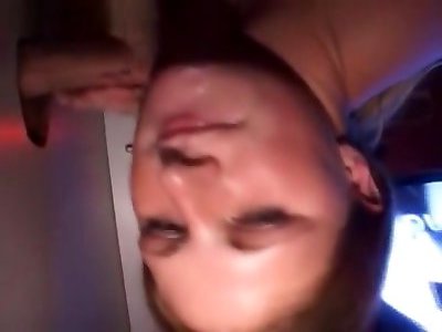 A slot in the wall with a spunk-pump and a gal sucking a man rod