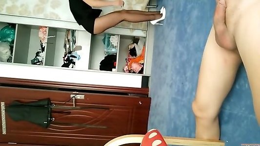 Wife loves doing handjob and footjob in black nylon socks and then cumming on her long legs